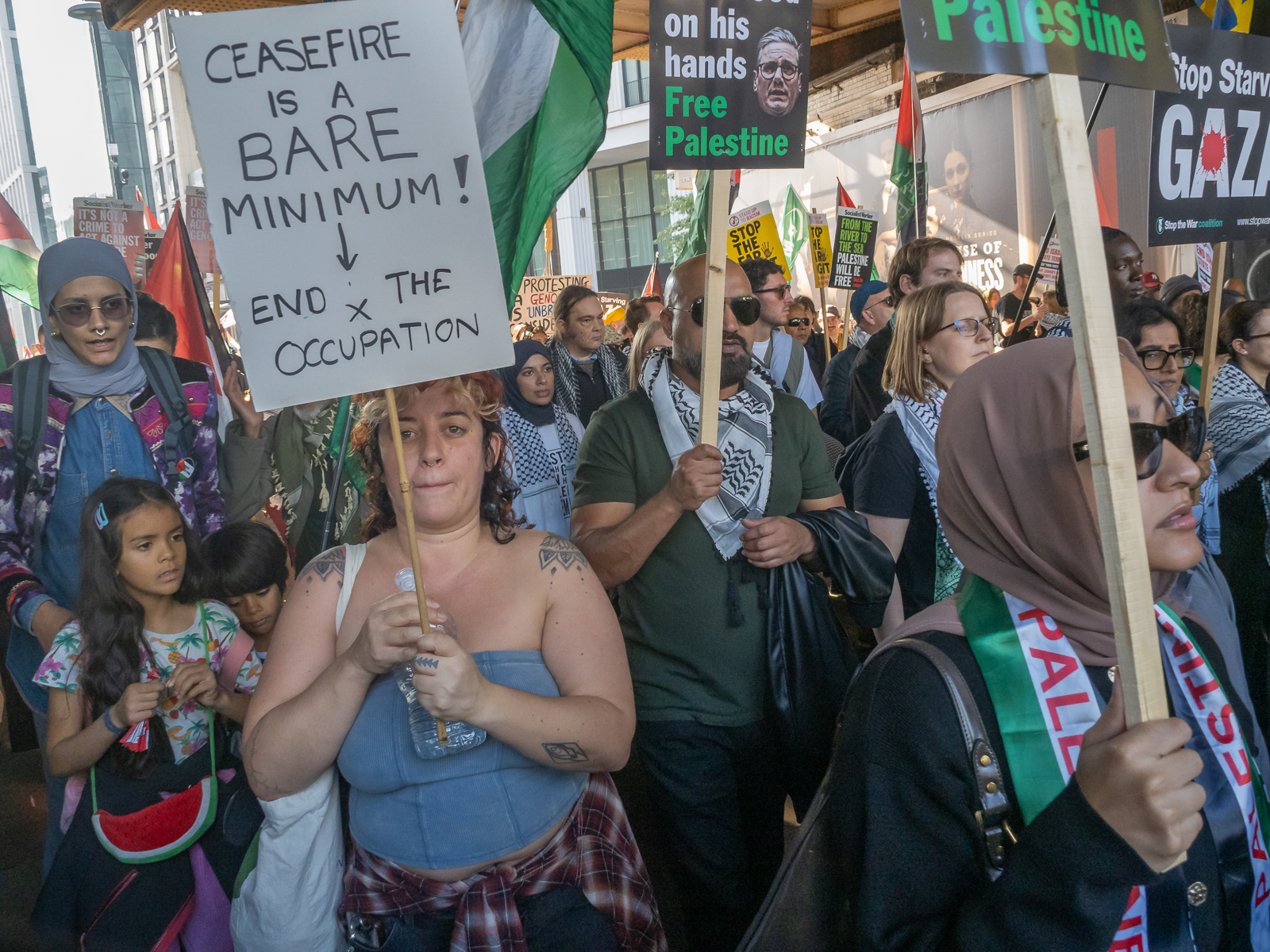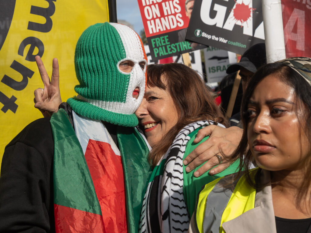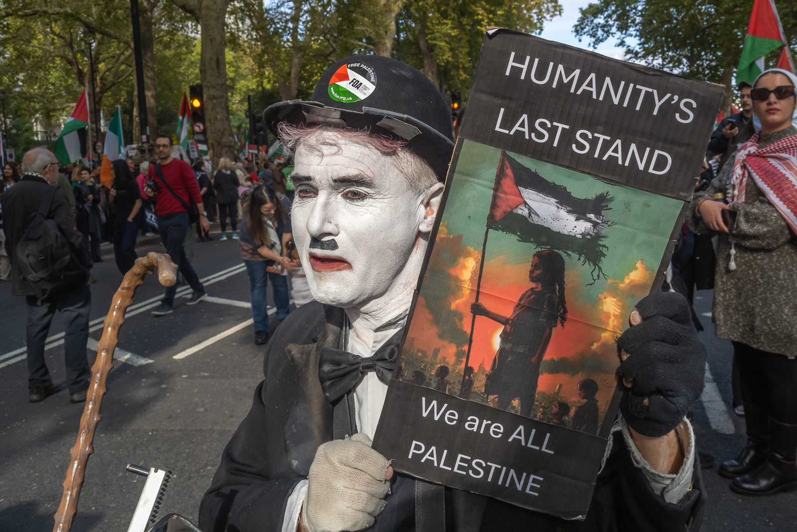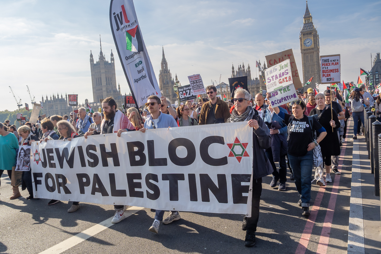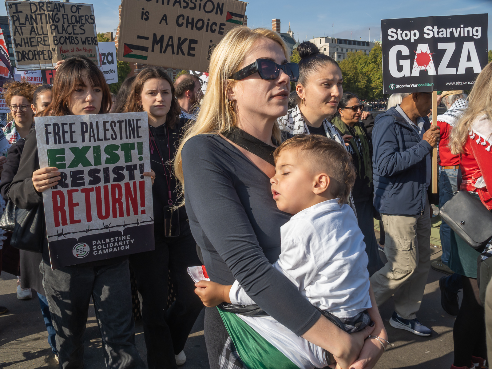 The people were marching again for Palestine—in defiance, in horror, in hope, demanding justice and peace, they came to London in their hundreds of thousands on Saturday (11 October). From Cambridge, Sheffield and Abergavenny; from Bristol, Swansea, Chesterfield and Manchester, they flowed through the city, surged down the streets: a great river of united, unifying humanity.. The Jewish Bloc marched along with Friends of Al Aqsa. Jewish Artists for Palestine marched, serious, next to small, excited schoolgirls. Hijabis walked with tall boys in face paint. Parents pushed prams, held the hands of toddlers; there were dog owners and trade unions, Imams and drummers; pensioners, hoodies, Quakers, Muslims, atheists, Christians, students and football fans. The full spectrum of life in this country, and they had all come together, against genocide, for Palestine, again.