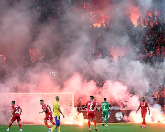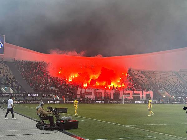 Photos: Israel Police / Sports5. Maccabi Tel Aviv banners read “We’re back from reserve duty” and “Harbu Derby“