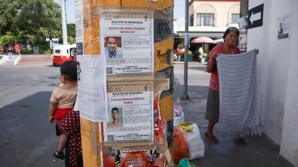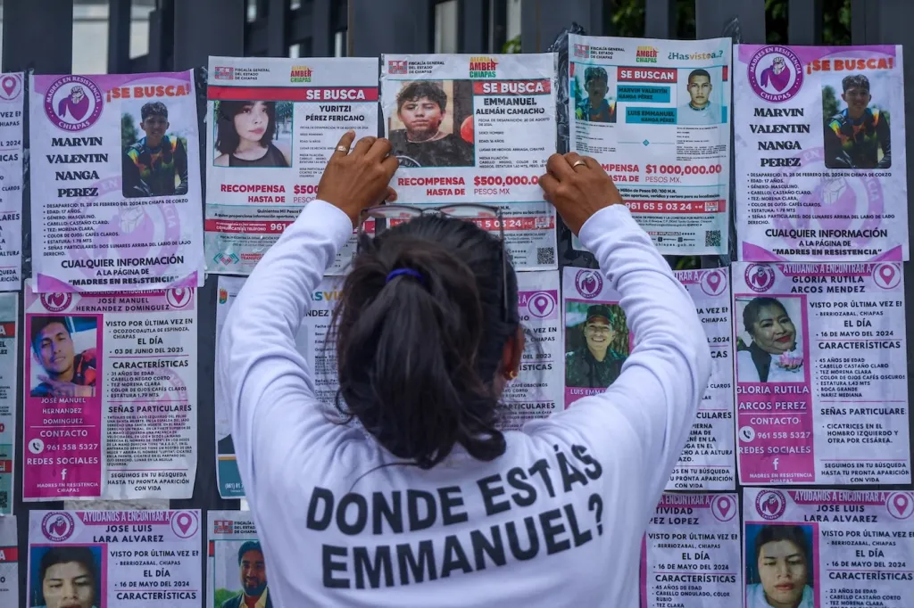 Adriana Camacho posts her son’s missing person flyer on a gate of the State Attorney General’s Office in Tuxtla Gutiérrez in October 2025. (Damián Sánchez)This journey in Mexico is not new; it began when Rosario Ibarra started searching for her son Jesús Piedra, who disappeared in 1975. In 2004, Silvia Ortiz, from Coahuila, began investigating her daughter Silvia. In 2012, Alicia Guillén, from Chiapas, searched for her son Eduardo abroad; María Herrera is trying to find her children who disappeared in Guerrero in 2008 and in Veracruz in 2010; Ceci Flores is also searching for her children, missing since 2015 and 2019; and since 2014, the families of the 43 students from the Ayotzinapa Rural Teachers’ College in Guerrero have been searching for them throughout the country.
