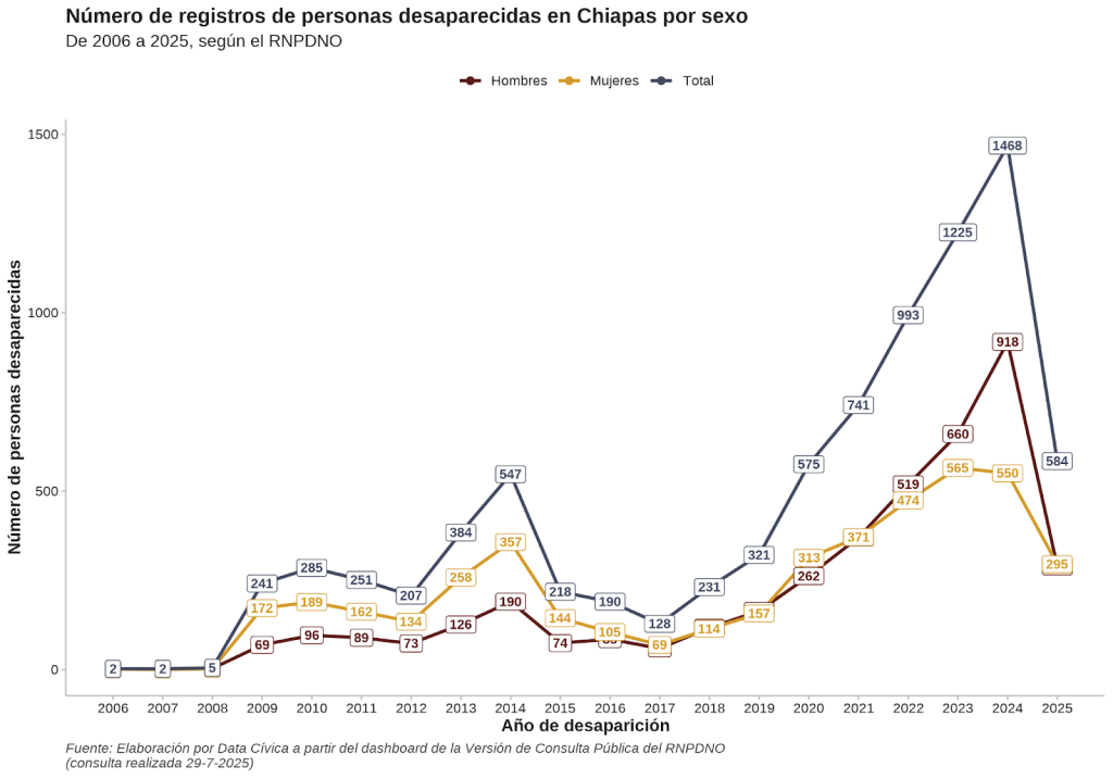 In Chiapas, disappearances began to increase in 2018, and continued to rise until reaching 8,589 people in the first half of 2025, according to a record made by Data Cívica with data from the National Registry of Missing and Unlocated Persons (RNPDNO).