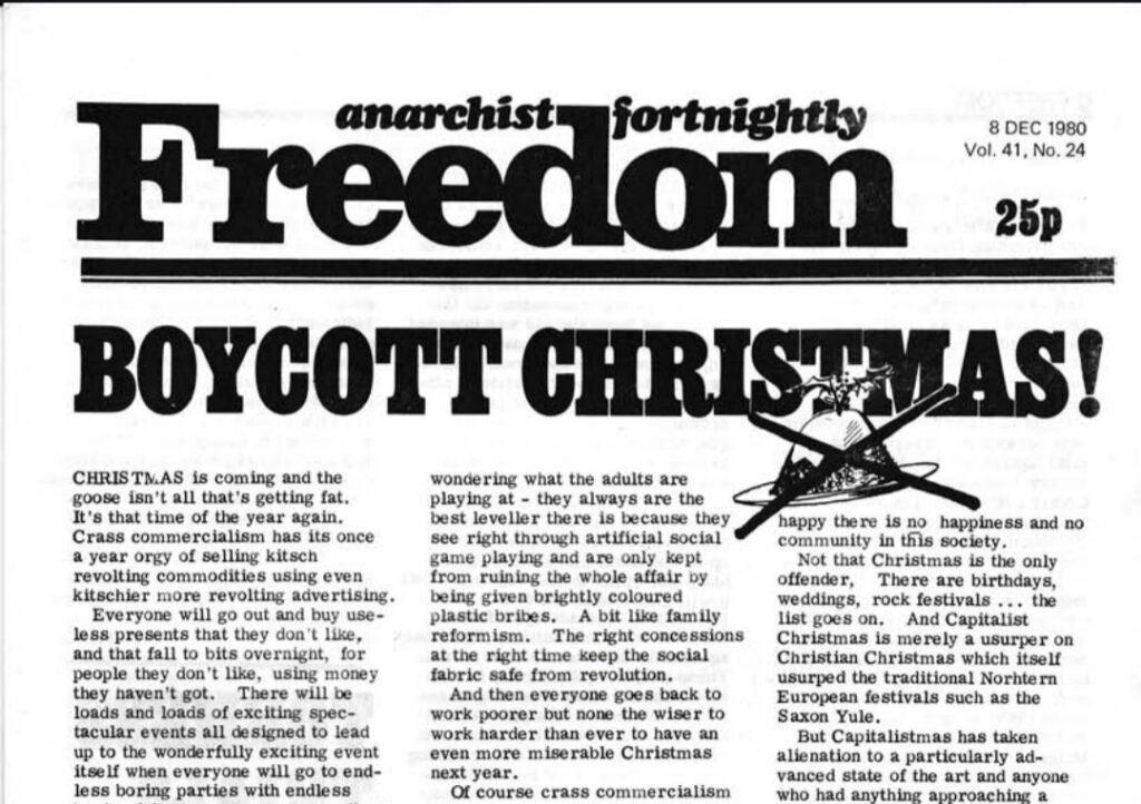 The 8 December 1980 edition of Freedom led with a bold call to action—BOYCOTT CHRISTMAS! A wonderfully curmudgeonly rant at ‘Capitalist Christmas’ penned by one of our predecessors, the piece veers between all-out assault on the hypocrisies of Christmas celebrations under capitalism and more poignant reflections on loneliness and mental health.