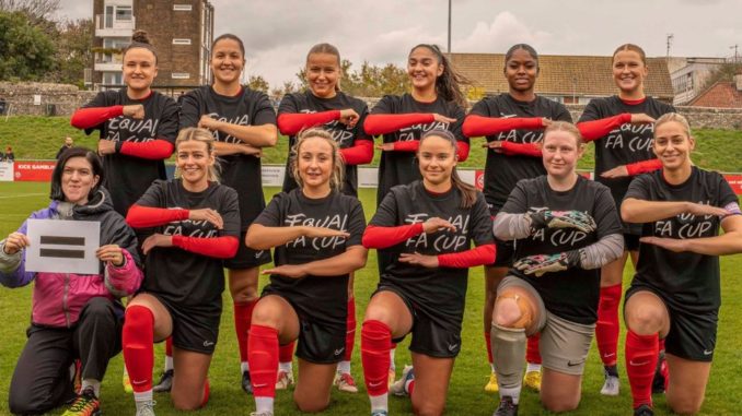 This is why Lewes FC wrote to all the teams participating in the Women’s FA Cup, inviting them to carry out protest actions such as a team photo before kickoff, with the players forming an “=” sign with their arms, and a 21-second pause after kickoff, referencing 1921, the year the FA banned women’s football. Lewes FC and Corsham Town did this during the first round.