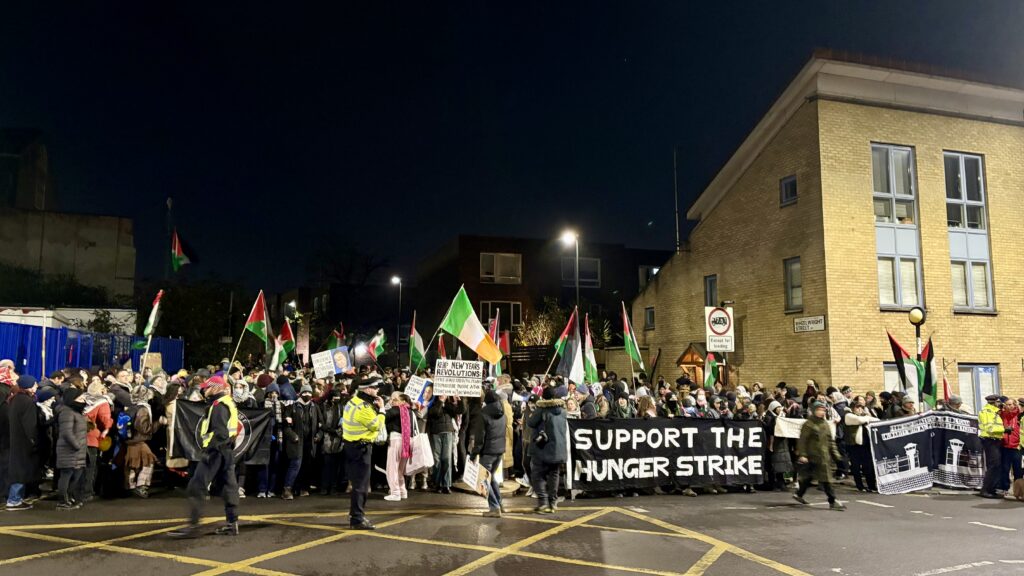 The traditional anarchist New Year’s Eve gathering outside HMP Pentonville was joined on December 31, 2025 by a solidarity demonstration for remand prisoners currently on hunger strike, organised by Palestine Pulse alongside other grassroots groups.